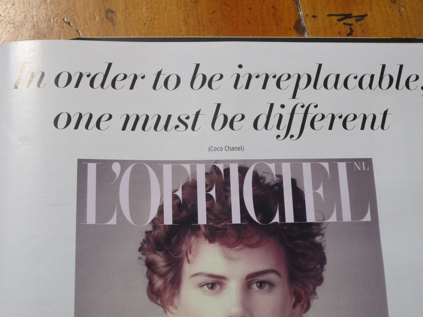 No such help for typesetters or spelling correctors (quality newspaper NRC’s? or magazine L’Officiel’s?) missing the absence of the intermediate e in irreplacable (in a headline no less) in this weekend’s NRC glossy DeLuxe, guest-edited by authors Leon de Winter and Jessica Durlacher: