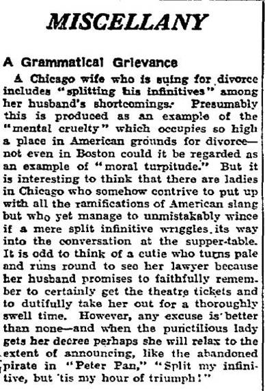 The printed word has not been the only subject of criticism throughout the years. The 1931 Manchester Guardian article below reports on how the most meticulous language pedants keep their ears out for the matters of language even when it comes to pillow talk. Several decades ago, prior to the general legal acceptance of the no-fault divorce in the US, which today guards privacy behind the veil of “irreconcilable differences”, the petitioners relied on “cruelty” for assuring substantial grounds for their legal case. Apparently, split infinitives were reason enough for suing for divorce.