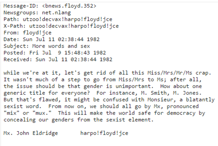 In the sentence above, however, singular they is not used as a generic pronoun, but as a pronoun in reference to a person not comfortable being addressed with masculine or feminine pronouns. Although it might catch some readers’ attention, this usage is nothing new in the transgender community, along with the usage of the honorific Mx – a title devoid of gender qualifications following the M* pattern (Mr, Ms, Miss, Mrs). Mx is widely accepted by many UK companies and organisations and it has been in use since the 1970s. Here is a snippet from the 1982 Google Group Usenet archive advocating the usage of Mx, and giving guidelines on the title’s pronunciation.