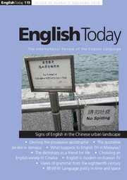 Here is the latest feature by a member of our project in the new issue of English Today. It is republished on this blog with permission from Cambridge University Press, which owns the copyright to this piece. The original is available at Cambridge Journals Online. To join the discussion, please respond on our website in the comments-box of the announcement of this feature, rather than by following the url in the article (which is there because we have to reproduce the article as it was published).